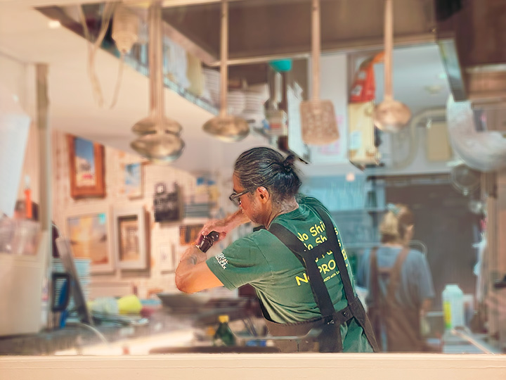 決定的なきっかけは、奥様のご友人と伊豆にサーフトリップへ行った帰り道だという。ふと目に留まったビルの“テナント募集”の貼り紙。「ダメもとで電話したら、あっさり決まっちゃって」。そこは、テラス席から海が一望できる絶好のロケーションだった。
